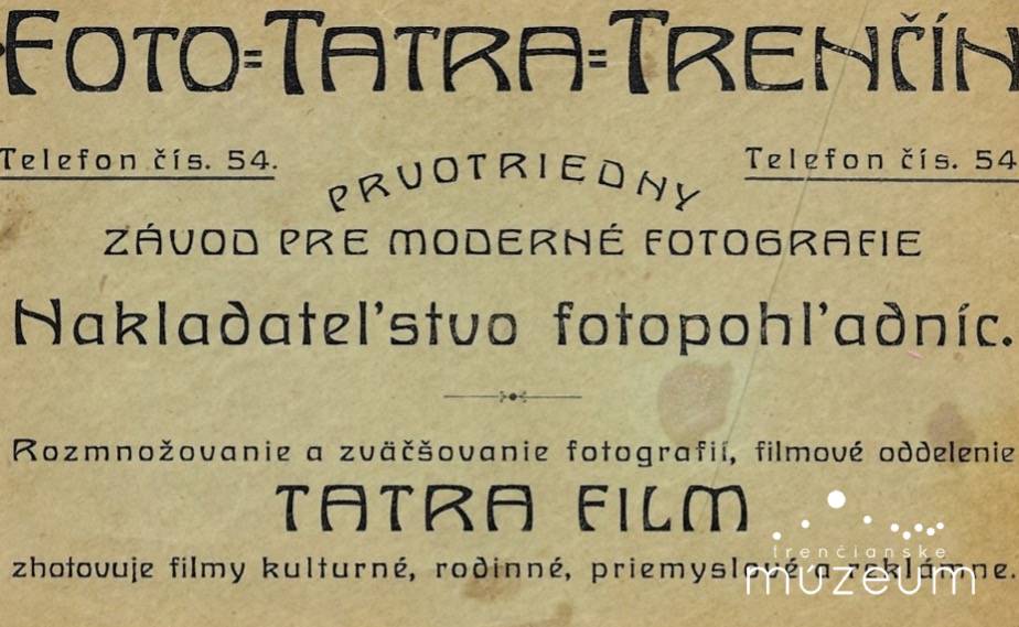 Reklama na fotografickú firmu „FOTO TATRA“ a kinematografický podnik „TATRAFILM“, zo zbierok Trenčianskeho múzea v Trenčíne