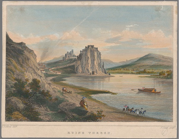 Veduta zrúcaniny hradu Devín z obdobia 1845-1855. Ludwig Rohbock, Ruine Theben. Galéria mesta Bratislavy.
