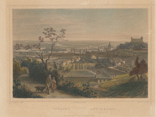 Veduta Bratislavy zo severu 1856 - 1860. Ludwig Rohbock, J. Carl Varrall, Pressburg. Galéria mesta Bratislavy.