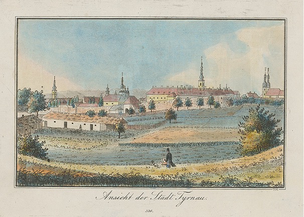 Veduta Trnavy z obdobia 1840 - 1860. Johann Vincenz Reim, Ansicht der Stadt Tyrnau.. Galéria mesta Bratislavy.